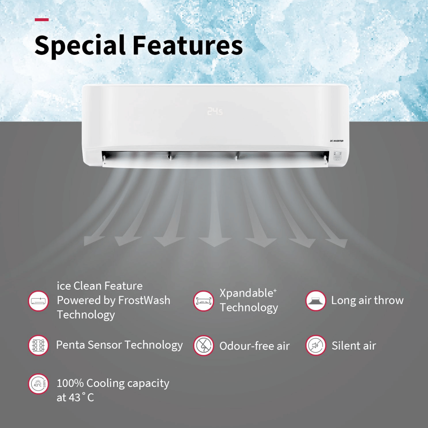 • Special Features: Anti Dust, Antimicrobial Protection, Anti-Corrosive Coating, LED Display, Self Diagnosis, Sleep Mode, Turbo, Adjustable Cooling.